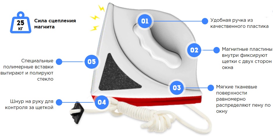 Мытье окон с двух сторон на высоте — опасное и неудобное занятие. Магнитная щетка решает эту проблему: одна часть снаружи, вторая — внутри, они соединяются магнитом и двигаются синхронно. Магнитная щетка для мытья окон особенно актуальна для квартир на верхних этажах, где нельзя вылезти наружу.